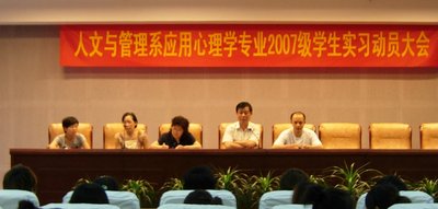 6月30日下午,人文与管理系在图书馆三楼学术报告厅隆重召开2007级应用心理学专业实习动员大会。系领导胡鸿、刘华、王军,系秘书谢海烽,年级辅导员王远芳及07应用心理学全体实习生参加了会议。会议由谢海烽老师主持。