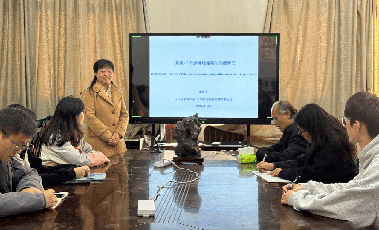 黄宏平教授以“蓝斑-下丘脑神经通路的功能研究”为题,在介绍特色的碳纤维电极电化学检测和电生理记录技术基础上,详细展示了团队研究发现大鼠蓝斑、下丘脑及相关核团在应激相关疾病中的神经通路功能等,还发现α2A肾上腺素能受体、血管紧张素2型受体以及N型电压门控钙离子通道等,是应激性高血压药物治疗的潜在分子靶点。并介绍了经颅直流电刺激(tDCS)在治疗应激相关疾病中的有效刺激模式及其可能分子机制等。研究充分体现了符合生物-心理-社会医学发展趋势的特色,相关技术和研究思路为其他师生开阔了眼界,并开展了交流和讨论,也为整合特色和交叉优势资源、开展整合性研究提供了借鉴。