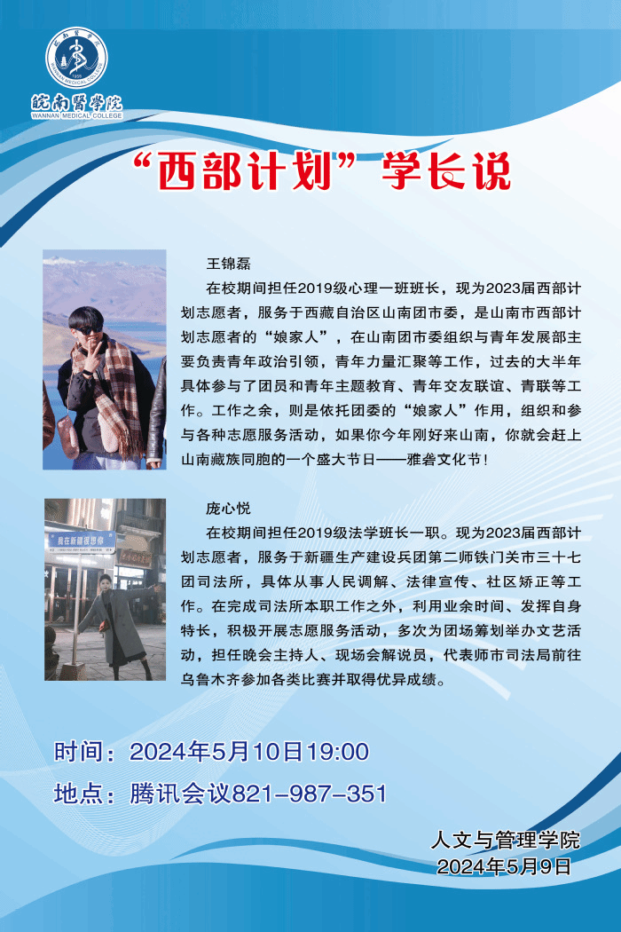 2023届法学专业庞心悦、应用心理学专业王锦磊分别介绍了自身加入西部计划的初心和心路历程,讲述了各自在新疆生产建设兵团第二师铁门关市三十七团司法所和山南团市委组织与青年发展部工作内容以及生活中的见闻,还给与会的同学报名西部计划提供了很多宝贵建议。两位员工表示,加入西部计划收获很大,不仅开拓了视野,感受到了祖国的幅员辽阔,也结识了很多志同道合的“战友”,更为重要的是能在祖国最需要的地方发光发热。钱彬彬介绍了西部计划的主要内容和政策要求,表示西部计划是国家层面的重大战略,广大同学要响应国家号召,为民族复兴伟业贡献青春力量。会上有志于加入西部计划的2020级员工还就有关问题进行了交流。