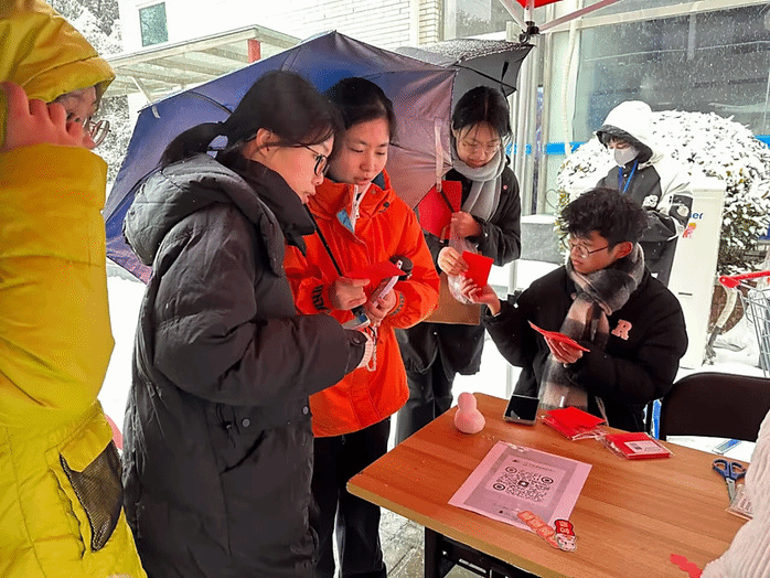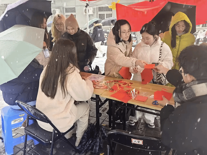12月18日,tyc8722太阳集团在赭麓校区开展了“喜迎元旦,青春献礼”活动。本次活动包括“窗花传情”、“爱国祝愿”两个环节,同学们在窗花用纸和祝福书写纸上挥洒创意,在活动过程中领略中华优秀传统文化的非凡魅力。虽然活动现场大雪纷飞,但难掩同学们的参与热情,现场气氛热闹非凡。
