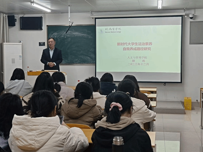 胡鸿以“新时代老员工法治素养自我养成路径研究”为题,从“新时代的特征及法治要求”、“新时代老员工法治素养的含义”、“老员工法治素养养成的重要性”“老员工法治素养的自我养成路径”等方面展开,重点阐述了新时代老员工的法治素养要求、新时代赋予医学院校员工的责任以及老员工法治素养的养成。胡鸿鼓励同学们在学习生活中不断学习法治知识,通过“把好弦、常讨论、常反思”不断训练法治思维,持续参加法治实践,早判断,早预防,早维护,牢固树立法治信仰,做到尊法守法。胡鸿勉励员工要与国家、社会、时代同心同向同行,成为社会主义法治的忠实崇尚者,自觉遵守者和坚定捍卫者。