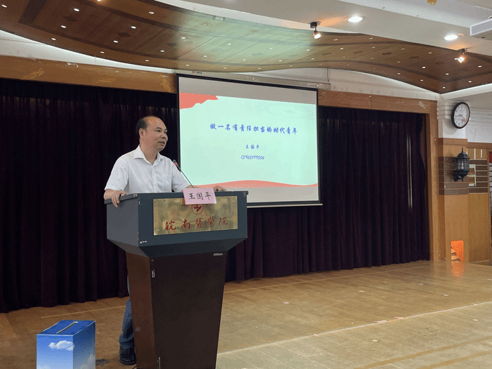 王国平以“做一名有责任担当的时代青年”为题,从学院和专业介绍、时代呼唤青年责任担当和责任担当要有“本领” 三个方面为同学们上开学第一课。王国平从国家卫生事业发展以及新时代青年面临的机遇和挑战的角度,详细分析了学院四个专业发展的目标、培养方案以及完成学业需要具备的知识和能力,勉励同学们要明确目标、刻苦学习,学真知识、长真本领。最后,学院领导向新生代表开展了赠书活动。会上,新生辅导员成铭老师向同学们介绍了年级基本情况。新生代表陶婧和老生代表刘逸楠作了交流发言。