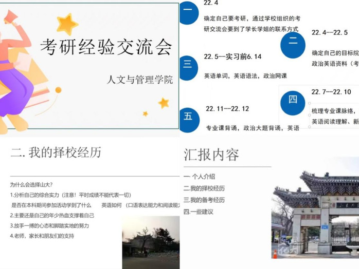 办一场学长学姐经验分享会。为帮助同学们打破考研信息差,充分认识了解考研赛道规律,4月19日至20日,学院邀请2023届考研成功的优秀学子举办考研经验交流线上分享活动。通过活动,同学们不仅学习到实用的考研经验,还从学长学姐榜样身上汲取了奋进力量。