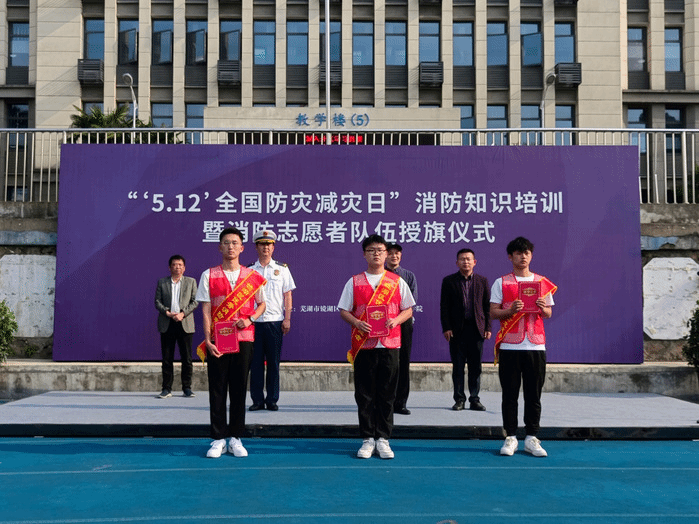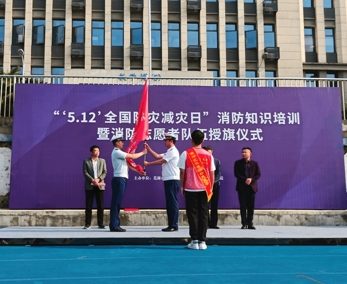 5月12日,芜湖市镜湖区消防救援大队在公司开展“5.12全国防灾减灾日”消防知识培训暨消防志愿者队伍授旗仪式。tyc8722太阳集团“博谘”实践队全体志愿者,党委书记王军和党委副书记钱彬彬出席活动。