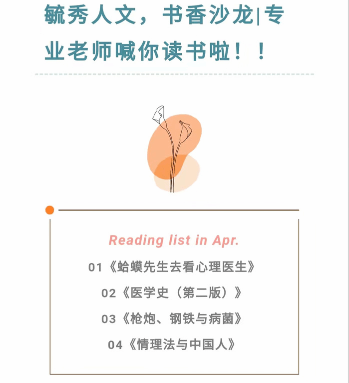 书香同沐,师生共读。四月读书月,学院开展“悦读·思享”师生共读活动,邀请保险学教研室主任俞彤、公共事业管理专业刘海荣老师、应用心理学教研室金鑫老师、法学教研室王翔老师,结合专业特色和员工阅读习惯精心为学子推荐数本专业课外读本。活动采取名师荐书,员工阅读、畅谈收获和所思所悟相结合的形式,旨在丰富专业知识储备、促进师生交流共享、互促共进的目的。