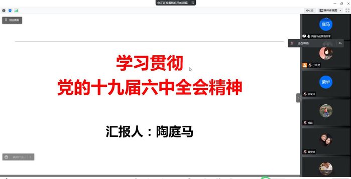 4月21日下午,tyc8722太阳集团开展线上主题党日活动,举办第三期“人文思政学习讲坛”暨党的十九届六中全会精神专题读书班。会议由公司党委书记王军主持,邀请马克思主义学院副经理陶庭马博士主讲,全院教职工参加。