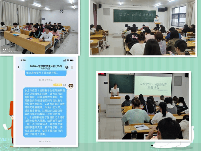 2021年6月18日,tyc8722太阳集团2020级分专业召开主题班会,增强同学们的安全防范意识,提高安全防范能力,全面普及安全常识;倡导员工树立诚信的良好品质,在生活中坚持“诚信为本”,养成讲诚信的好习惯。应用心理学专业先由班长带领同学学习安全教育方面的基本知识,继而通过互动引导同学们通过自我思考,自我剖析,并结合自身经历,谈谈安全隐患可能带来的不利影响以及相应举措,让同学们认识到自己在安全防范方面存在的不足,从而达到提高同学们安全防范能力的目的。法学专业赵庆伟同学向同学们介绍了预防溺水重点六不,提高防溺水的意识。公共事业管理专业重点向同学介绍电信(网络)诈骗的主要手段与常见情形,图文并茂地要求大家提高防范意识,打击电信犯罪。保险学专业班委通过同学们喜闻乐见的短视频类型的相关宣传片,以幽默风趣的形式加强同学们的诚信教育,树立诚信之风;普及安全知识,提高避险能力。