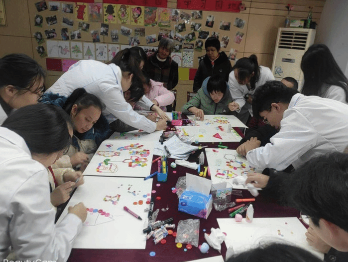 志愿者用歌声为此次志愿活动拉开帷幕。志愿者们与“孩子们”一对一服务,开展我画你猜、纽扣作画等活动,大家共同思考、配合默契,现场气氛高涨。活动结束后,志愿队成员与社区残疾人士合影留念。