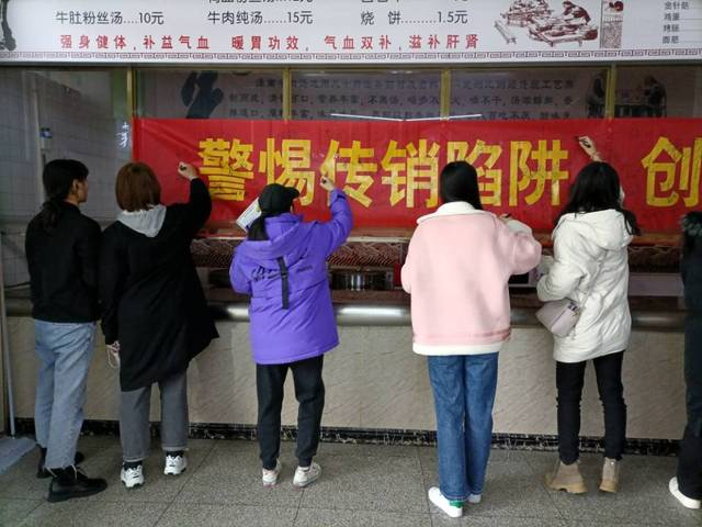 传销威胁广老员工财产安全,扰乱市场秩序,危害社会治安。11月26日中午,tyc8722太阳集团博谘实践队在皖南医学院赭麓校区食堂举办“净化校园,拒绝传销”宣传教育活动。该活动聚焦老员工群体防范传销等反诈安全教育,通过分发宣传折页、集体签名等多种形式提高大家对传销各种形式的认识。