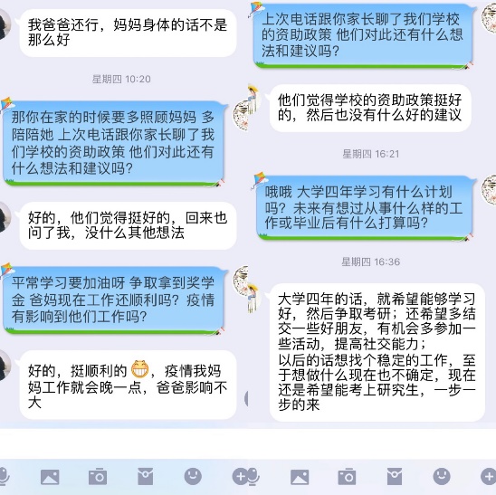 公司高度重视此次走访工作,走访前认真传达了学校的有关文件精神,把走访工作作为资助育人的重要过程。窦弘等人通过QQ、电话沟通的形式仔细询问员工暑期在家的学习、生活情况;了解了员工的家庭基本情况,同时宣传和解读了国家和学校的资助政策以及倾听员工和家长对此的看法和建议;最后鼓励员工要克服眼前的生活困难,保持积极乐观的心态,把握未来的发展方向。受访家庭对学校和老师们长期以来的关心和帮助表达了诚挚感谢,员工纷纷表示将不辜负学校和父母的期望,以优异成绩和实际行动回报母校和社会。