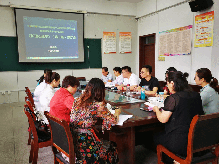 2019年7月12日,心理与健康促进科技创新团队在心理学教研室召开《护理心理学》第三版教材编写修订会议,皖南医学院、安徽中医药高等专科学校、芜湖第四人民医院等单位的编委参加了会议。会议由杭荣华主持。