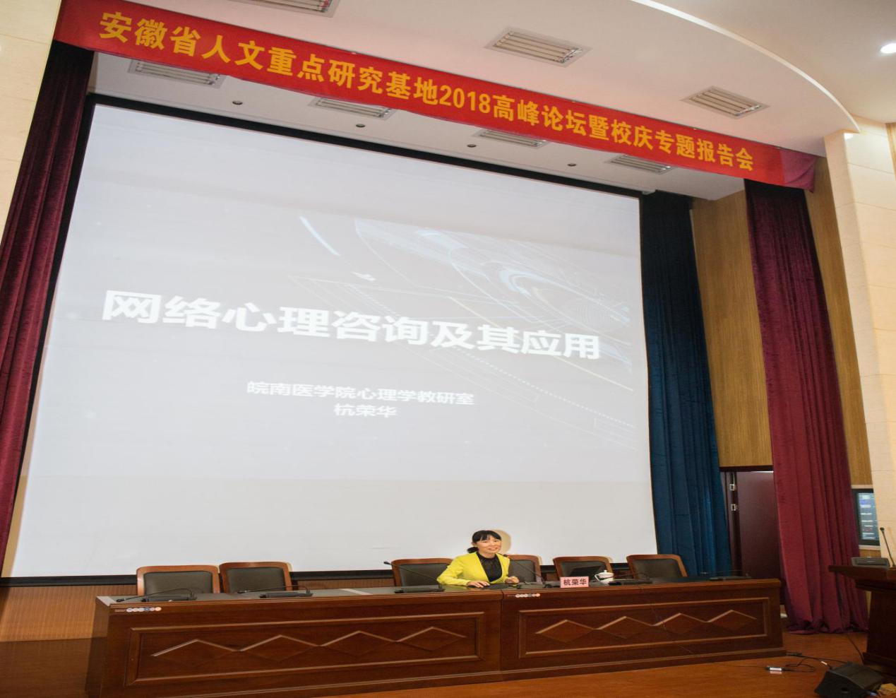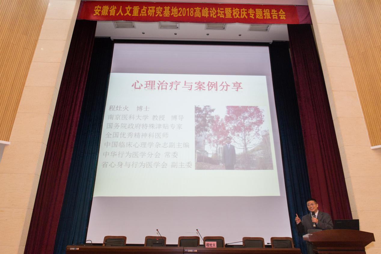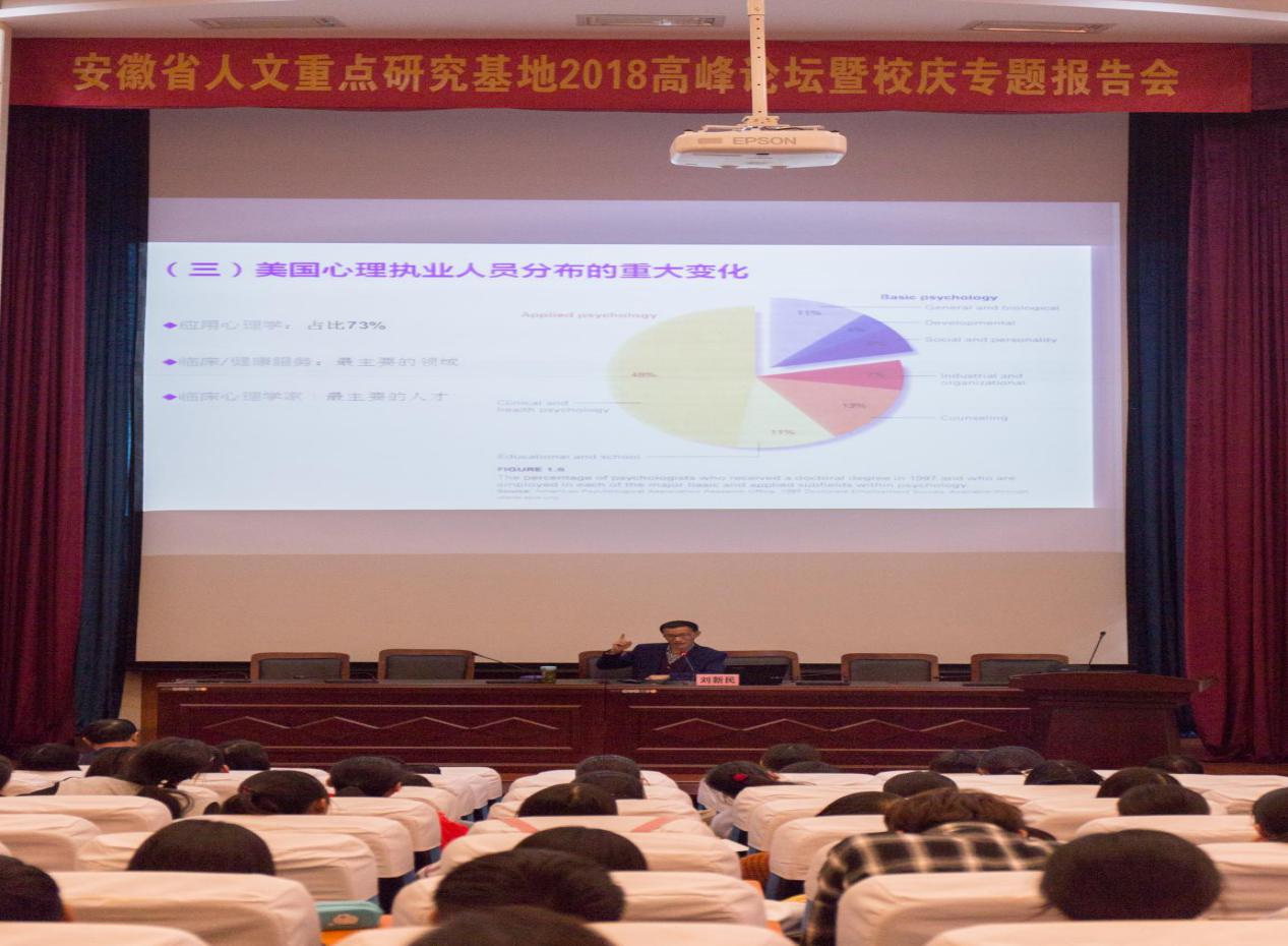 在举校同庆建校60周年之际,11月2日上午,安徽省人文重点研究基地老员工心理健康教育研究中心在逸夫楼学术报告厅举行2018年度高峰论坛暨校庆专题报告会。人文重点研究基地前任主任、中华医学会行为分会“终生成就奖”获得者刘新民教授、心理学教研室应用心理学硕士点负责人杭荣华教授、无锡市精神卫生中心经理程灶火教授、“邻家好医”创始人&董事长罗林分别做了精彩纷呈的专题报告。人文重点研究基地各研究方向的负责人、骨干成员、基地各研究项目负责人出席了本次论坛,全体心理学专业研究生和本科生聆听了报告会。论坛由tyc8722太阳集团经理胡鸿主持。