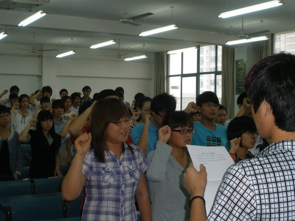 全体同学在班委周凯的带领下庄严承诺:诚信考试,绝不作弊。并签下承诺书。