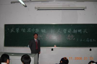 11月12日晚七点,人文与管理系08级全体同学在西104教室聆听了中国教育专家委员会委员、中国首批教育咨询师、奥运火炬手薛保红老师关于老员工职业规划的讲座。这次讲座是我系“庆学校五十华诞,创人管崭新明天”的系列活动之一。08级辅导员吴映辉老师出席并主持了本次讲座。