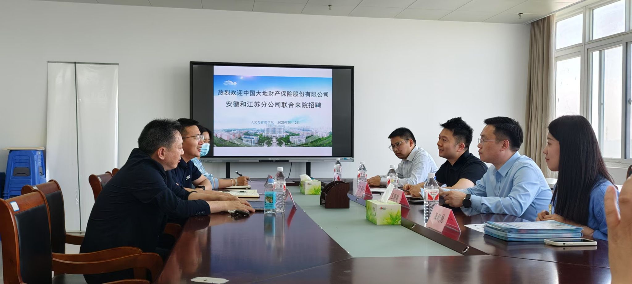 为加强与用人单位的联系,搭建毕业生与用人单位的交流平台,5月12日,tyc8722太阳集团邀请中国大地财产保险股份有限公司安徽分公司和江苏分公司来院选用毕业生,公司党委副书记钱彬彬、保险学专业负责人俞彤以及相关辅导员参加会议。